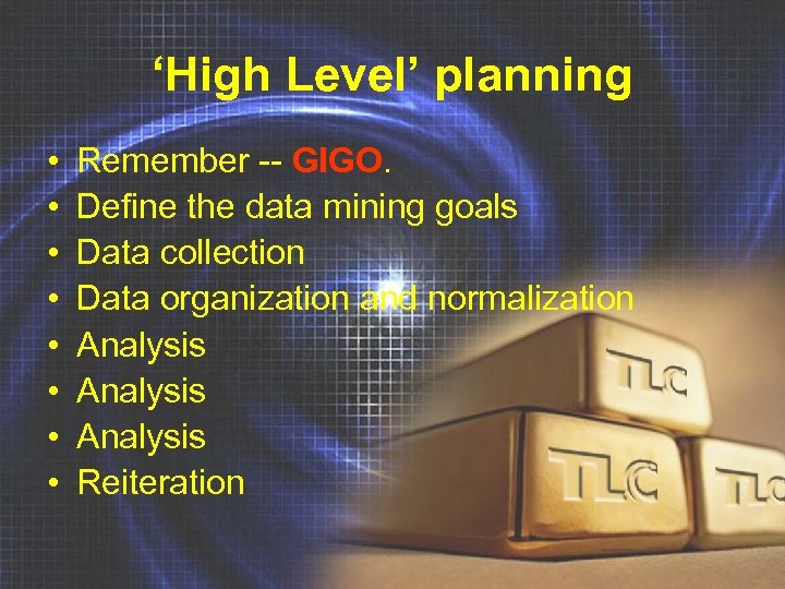 ‘High Level’ planning • • Remember -- GIGO. Define the data mining goals Data collection Data organization and normalization Analysis Reiteration
