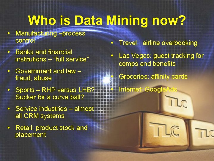 Who is Data Mining now? • Manufacturing –process control • Banks and financial institutions – “full service” • Government and law – fraud, abuse • Sports – RHP versus LHB? Sucker for a curve ball? • Service industries – almost all CRM systems • Retail: product stock and placement • Travel: airline overbooking • Las Vegas: guest tracking for comps and benefits • Groceries: affinity cards • Internet: Google. Ads