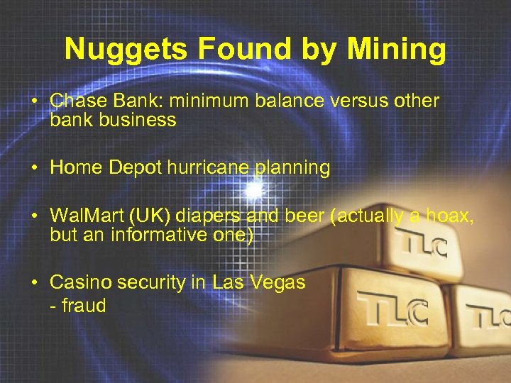 Nuggets Found by Mining • Chase Bank: minimum balance versus other bank business • Home Depot hurricane planning • Wal. Mart (UK) diapers and beer (actually a hoax, but an informative one) • Casino security in Las Vegas - fraud