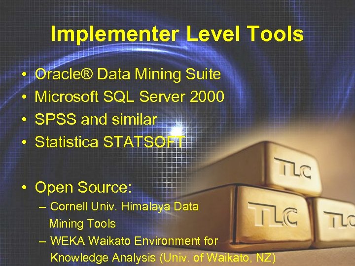 Implementer Level Tools • • Oracle® Data Mining Suite Microsoft SQL Server 2000 SPSS and similar Statistica STATSOFT • Open Source: – Cornell Univ. Himalaya Data Mining Tools – WEKA Waikato Environment for Knowledge Analysis (Univ. of Waikato, NZ)