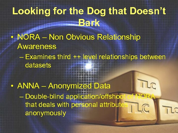Looking for the Dog that Doesn’t Bark • NORA – Non Obvious Relationship Awareness – Examines third ++ level relationships between datasets • ANNA – Anonymized Data – Double-blind application/offshoot of NORA that deals with personal attributes anonymously