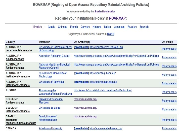 Registry of Open Access Repositories (ROAR): 1000 archives but still mostly empty! * India (24) Country http: //roar. eprints. org/ Archive Type * Research Institutional or Departmental (467) * Research Cross-Institution (77) * e-Theses (84) * e-Journal/Publication (102) * Database (18) * Demonstration (24) * Other (134) Software Archives Records Mean DSpace 242 EPrints 231 BEPress 56 OPUS 26 ETD-db 23 Other (various) 228 937833 323015 136158 13377 343840 5097 1489 2670 608 18097 * Netherlands (24) * Belgium (13) 1 United States (215) * Denmark (6) 2 United Kingdom (102) * China (5) 3 Germany (79) * Mexico (5) 4 Brasil (53) * Finland (4) (11) 5 Canada (40) * Switzerland (4) 6 France (38) * Portugal (4) 7 Japan (35) * Hungary (4) 8 Sweden (34) * Portugal (4) 9 Australia (33) * South Africa (4) 9 Spain (29) * Chile (3) 10. Italy (28 * Austria (3) * Colombia (3) * * Ireland (2) * Norway (2) * Russia (2) * Greece (2) * Turkey (1) * Argentina (1) * Israel (1) * Slovenia (1) * Croatia (1) * Namibia (1) * Peru (1) * Taiwan (1) * Pakistan (1) * New Zealand (1) * Costa Rica