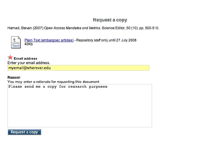 42. For the articles in the 37% of journals that have an embargo policy, the free EPrints institutional Repository-creating software has an ”Eprint Request" Button: The user who reaches the metadata for a Closed Access article puts his email in a box and clicks. This sends an automatic email to the author, with a URL on which the author clicks to automatically email the eprint to the requester.