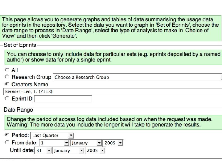 The free EPrints University Repository Software generates rich (and potentially even richer) usage metrics. It can be used for showcasing, navigating, comparing and assessing. Here is a sample of University Repository usage metrics for Southampton author Tim Berners-Lee: http: //stats. eprints. ecs. soton. ac. uk/cgi-bin/irstats. cgi?