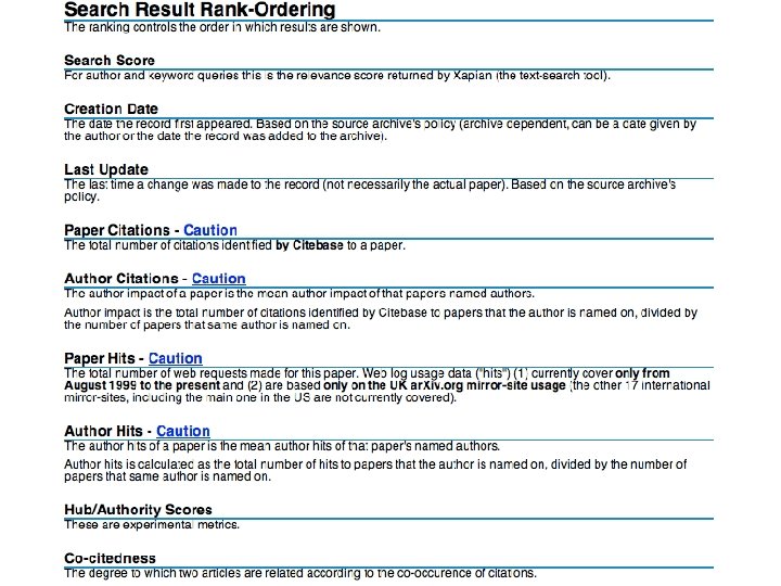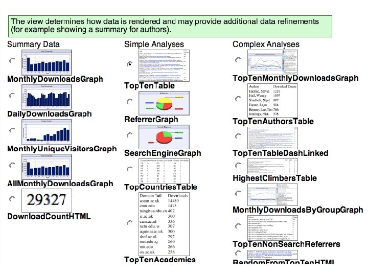 Sample of candidate OA-era metrics: • • • • Citations (C) Cite. Rank (like Google) Co-citations Downloads (D) C/D Correlations Hub/Authority index Chronometrics: Latency/Longevity Endogamy/Exogamy Book citation index Links Tags Commentaries Journal Impact Factor • • h-index (and variants) Co-authorships Publication counts Number of publishing years Semiometrics (latent semantic indexing, text overlap, etc. ) Research funding Students Prizes