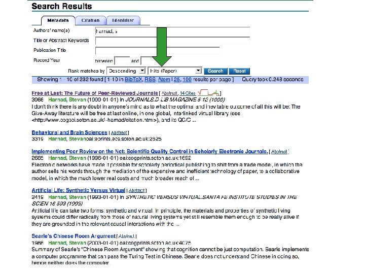 Collaborators: • • Brody, Tim (U. Southampton, Eprints) Carr, Les (U. Southampton, EPrints) Gargouri, Yassine (U. Québec/Montréal) Gingras, Yves (U. Québec/Montréal) Hajjem, Chawki (U. Québec/Montréal) Hitchcock, Steve (U. Southampton, EPrints) Sale, Arthur (U. Tasmania) Swan, Alma (U. Southampton, EPrints, Key Perspectives)