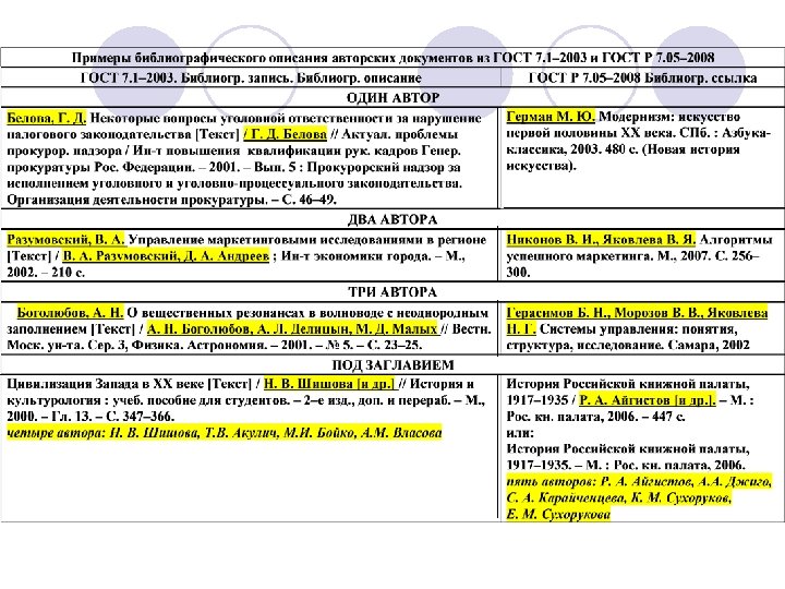 ГОСТ Р 7. 05– 2008 v. ГОСТ Р 7. 05– 2008 «Библиографическая ссылка» был бы более «удобен» для подготовки списков литературы: заголовок может содержать до трех авторов, можно не применять квадратные скобки, часто используемые в ГОСТ 7. 1– 2003, и т. д. , но в ГОСТе 2008 г. оговаривается, что v «Совокупность затекстовых библиографических ссылок не является библиографическим списком или указателем, как правило, также помещаемыми после текста документа и имеющими самостоятельное значение в качестве библиографического пособия» .