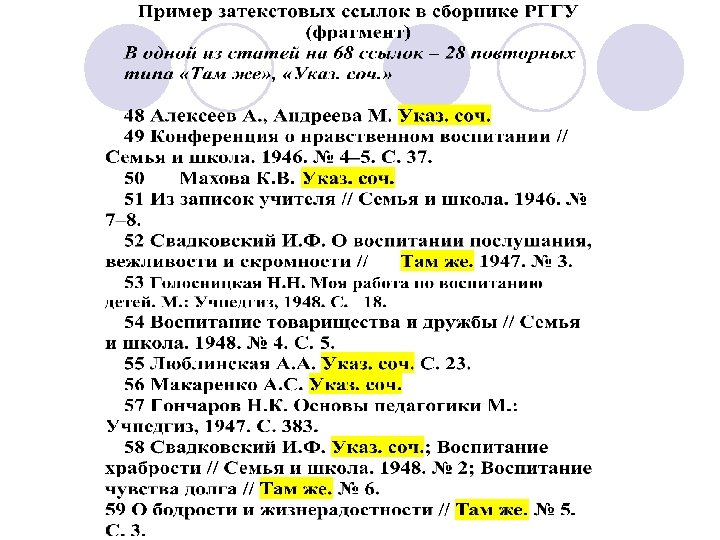 v. Кроме потерь информации, о которых говорилось выше, такие ссылки просто неудобны для восприятия и использования. Найдя нужную ссылку, видишь, что эта ссылка повторная, не дает необходимых данных (например: Макаренко А. С. Указ. соч. ), и надо просматривать весь список ссылок, чтобы найти первичную.