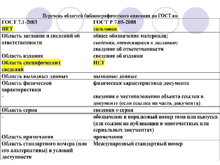 Особенности ГОСТ 7. 1– 2003 v. ГОСТ 7. 1– 2003 «Библиографическая запись. Библиографическое описание» создан взамен ГОСТ 7. 1– 84 «Библиографическое описание документа» . В стандарте 1984 г. были объединены все регламентирующие материалы на библиографическое описание (полное библиографическое описание, включая заголовок, библиографические ссылки). v. Регламентирующие материалы на библиографическое описание разнесены по разным ГОСТам. В результате теряется целостное представление о библиографической записи. И если в отмененном ГОСТ 7. 1– 84 заголовок был представлен как часть библиографического описания, то в действующем стандарте – нормативная ссылка на ГОСТ 7. 80 -2000 «Заголовок» .