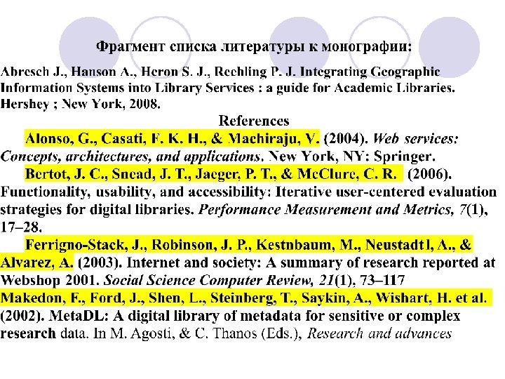 Зарубежный опыт оформления библиографических ссылок (прикнижных, пристатейных списков литературы) v. Прикнижные и пристатейные списки в зарубежных изданиях называются «References» (ссылки). v. Указываются три и более, все авторы публикаций. v. Ссылки выстроены в алфавитном порядке, каждый документ указывается в списке однократно. v. В описании приводятся необходимые данные, которых вполне достаточно для характеристики документа.
