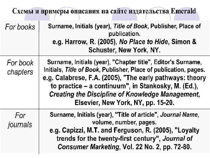 Зарубежный опыт оформления библиографических ссылок (прикнижных, пристатейных списков литературы) v. На сайтах крупных зарубежных издательств выставляются образцы описания документов в ссылках (списках литературы) для публикаций в журналах. v. В качестве примера можно привести сайт издательства Emerald, где даны простые схемы описания документов в пристатейных списках литературы и приведены примеры библиографического описания