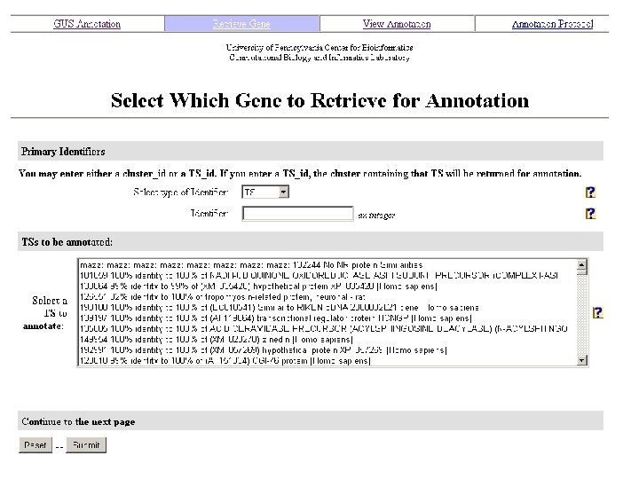 Annotation Tasks include: On Gene page: 1. Assigning reference RNA sequence. 2. Determining members of Gene cluster (RNA transcripts) – removing or adding members - validating RNA transcripts assigned to gene using genomic alignment, BLAST similarity and/or c. DNA clone linkages 3. Adding approved abbreviated gene name or symbol (if known) and evidence Gene description field: 4. Adding approved full gene name, aliases and evidence for them 5. Adding gene synonyms and evidence for them Gene Annotation is displayed on Gene page of allgenes. org