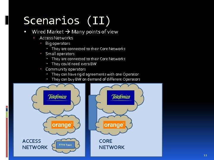 Scenarios (I) Mobile Market 2 proposals Mobile Virtual Network Operator (MVNO) Buy FIXED BW Buy VARIABLE BW On Demand Operators When an Operator is saturated or in NO coverage areas Buy VARIABLE BW On Demand Possible consequences: MVNO are not restricted to only 1 operator competence in prices MVNO can buy BW depending on their necessities granularity Operators can buy BW temporarily in saturated or NO coverage areas Can detect new HOT POINTS to invest with new equipments Operators can find a new Business Opportunity selling BW to Third Parties BW STOCK MARKET MOVISTAR 75% 25% ORANGE 50% VODAFONE 80% 20% Why don’t we use this extra BW? 10