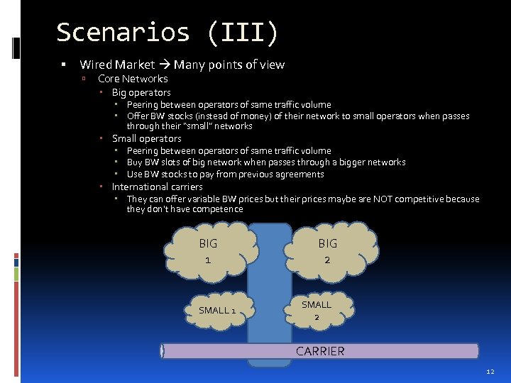Scenarios (II) Wired Market Many points of view Access Networks Big operators They are connected to their Core Networks Small operators They are connected to their Core Networks They could need extra BW Community operators They can have rigid agreements with one Operator They can buy BW on demand of different Operators ACCESS NETWORK FTTH Town CORE NETWORK 11