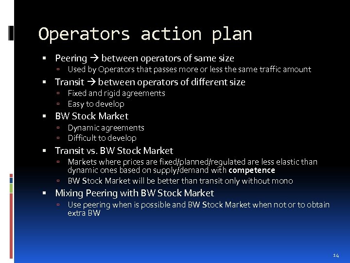 Scenarios (III) Wired Market Many points of view Core Networks Big operators Peering between operators of same traffic volume Offer BW stocks (instead of money) of their network to small operators when passes through their “small” networks Small operators Peering between operators of same traffic volume Buy BW slots of big network when passes through a bigger networks Use BW stocks to pay from previous agreements International carriers They can offer variable BW prices but their prices maybe are NOT competitive because they don’t have competence BIG 1 SMALL 1 BIG 2 SMALL 2 CARRIER 12
