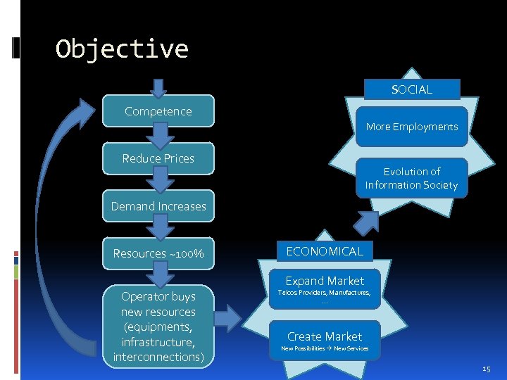 Objective SOCIAL Competence More Employments Reduce Prices Evolution of Information Society Demand Increases Resources ~100% ECONOMICAL Operator buys new resources (equipments, infrastructure, interconnections) Telcos Providers, Manufactures, . . . Expand Market Create Market New Possibilities New Services 15