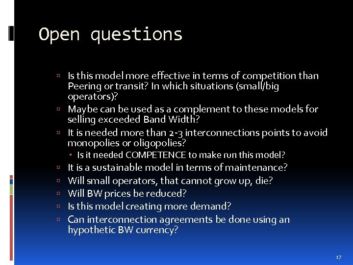 Open questions Is this model more effective in terms of competition than Peering or transit? In which situations (small/big operators)? Maybe can be used as a complement to these models for selling exceeded Band Width? It is needed more than 2 -3 interconnections points to avoid monopolies or oligopolies? Is it needed COMPETENCE to make run this model? It is a sustainable model in terms of maintenance? Will small operators, that cannot grow up, die? Will BW prices be reduced? Is this model creating more demand? Can interconnection agreements be done using an hypothetic BW currency? 17