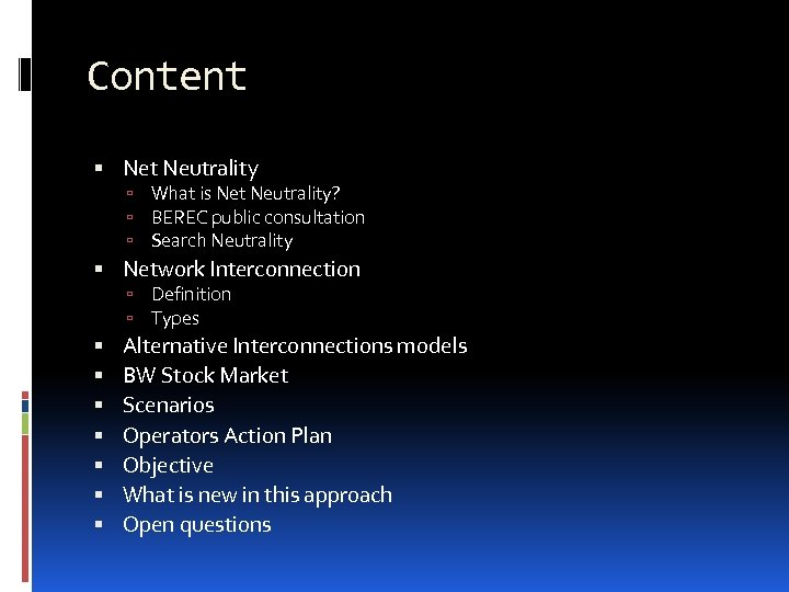 Content Net Neutrality What is Net Neutrality? BEREC public consultation Search Neutrality Network Interconnection Definition Types Alternative Interconnections models BW Stock Market Scenarios Operators Action Plan Objective What is new in this approach Open questions