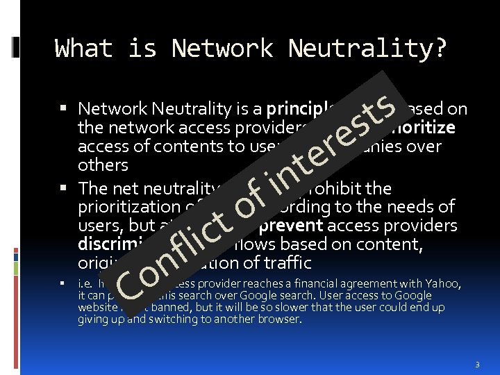 What is Network Neutrality? ts s Network Neutrality is a principle that is based on the network access providers can not prioritize access of contents to users or companies over others The net neutrality does not prohibit the prioritization of flows according to the needs of users, but attempts to prevent access providers discriminate these flows based on content, origin or destination of traffic re te in f o t ic fl n o C i. e. If a network access provider reaches a financial agreement with Yahoo, it can prioritize this search over Google search. User access to Google website is not banned, but it will be so slower that the user could end up giving up and switching to another browser. 3