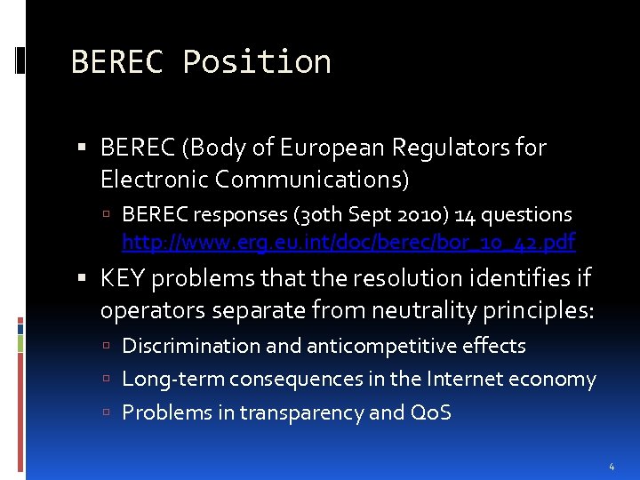 BEREC Position BEREC (Body of European Regulators for Electronic Communications) BEREC responses (30 th Sept 2010) 14 questions http: //www. erg. eu. int/doc/berec/bor_10_42. pdf KEY problems that the resolution identifies if operators separate from neutrality principles: Discrimination and anticompetitive effects Long-term consequences in the Internet economy Problems in transparency and Qo. S 4