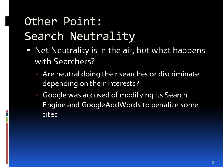 Other Point: Search Neutrality Net Neutrality is in the air, but what happens with Searchers? Are neutral doing their searches or discriminate depending on their interests? Google was accused of modifying its Search Engine and Google. Add. Words to penalize some sites 5