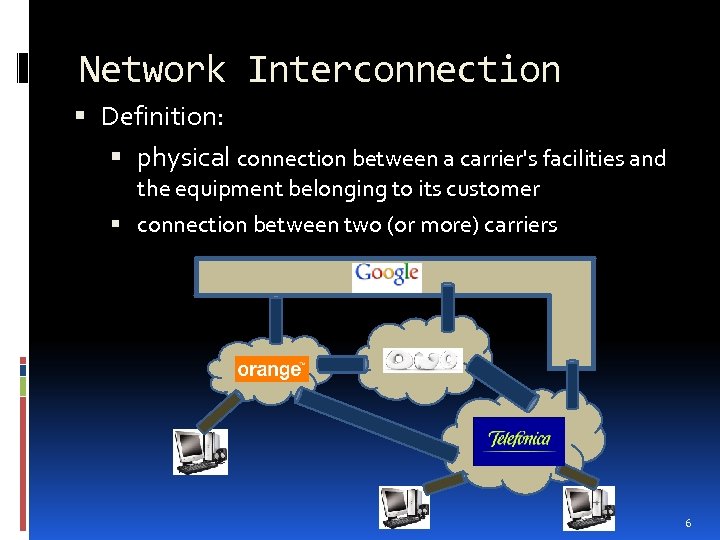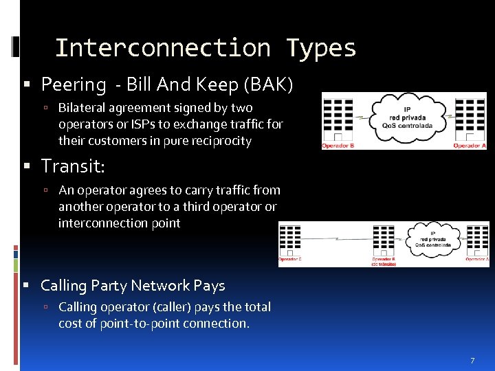 Network Interconnection Definition: physical connection between a carrier's facilities and the equipment belonging to its customer connection between two (or more) carriers 6