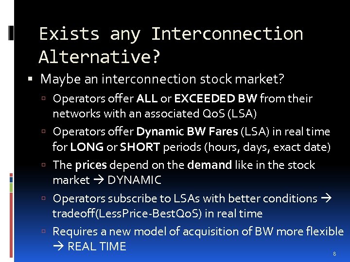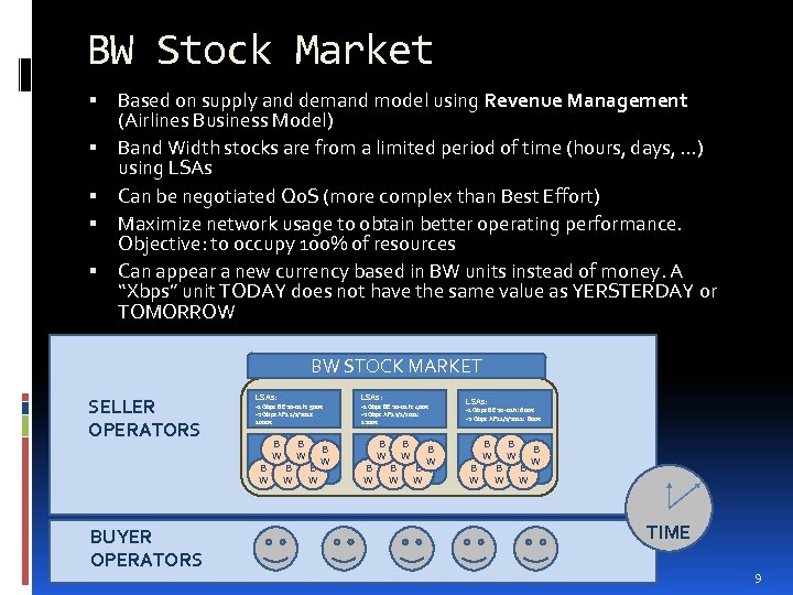 Exists any Interconnection Alternative? Maybe an interconnection stock market? Operators offer ALL or EXCEEDED BW from their networks with an associated Qo. S (LSA) Operators offer Dynamic BW Fares (LSA) in real time for LONG or SHORT periods (hours, days, exact date) The prices depend on the demand like in the stock market DYNAMIC Operators subscribe to LSAs with better conditions tradeoff(Less. Price-Best. Qo. S) in real time Requires a new model of acquisition of BW more flexible REAL TIME 8