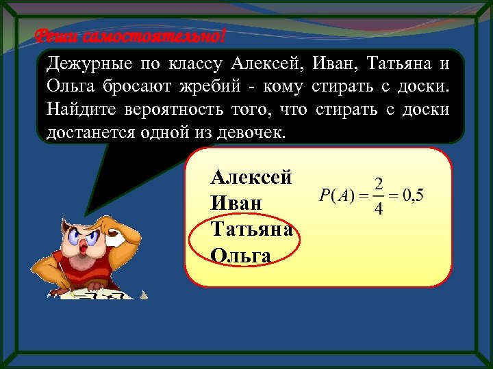 Реши самостоятельно! Дежурные по классу Алексей, Иван, Татьяна и Ольга бросают жребий - кому стирать с доски. Найдите вероятность того, что стирать с доски достанется одной из девочек. Алексей Иван Татьяна Ольга
