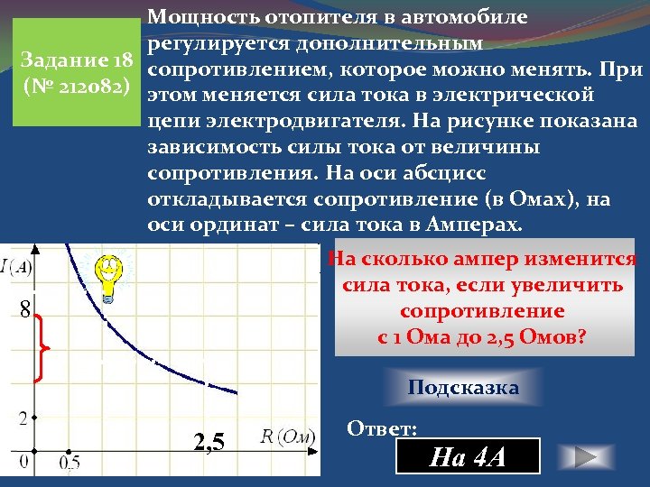 Мощность отопителя в автомобиле регулируется дополнительным Задание 18 сопротивлением, которое можно менять. При (№ 212082) этом меняется сила тока в электрической цепи электродвигателя. На рисунке показана зависимость силы тока от величины сопротивления. На оси абсцисс откладывается сопротивление (в Омах), на оси ординат – сила тока в Амперах. На сколько ампер изменится сила тока, если увеличить сопротивление с 1 Ома до 2, 5 Омов? 8 Подсказка 2, 5 Ответ: На 4 А