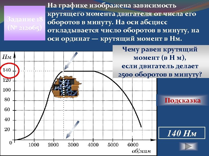 На графике изображена зависимость крутящего момента двигателя от числа его Задание 18 оборотов в минуту. На оси абсцисс (№ 212065) откладывается число оборотов в минуту, на оси ординат — крутящий момент в Нм. Чему равен крутящий момент (в Н м), если двигатель делает 2500 оборотов в минуту? Подсказка Ответ: 140 Нм