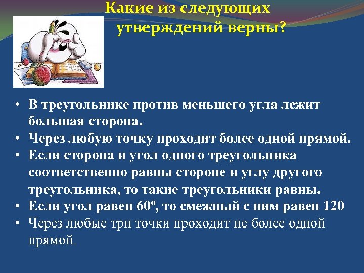 Какие из следующих утверждений верны? • В треугольнике против меньшего угла лежит большая сторона. • Через любую точку проходит более одной прямой. • Если сторона и угол одного треугольника соответственно равны стороне и углу другого треугольника, то такие треугольники равны. • Если угол равен 60º, то смежный с ним равен 120 • Через любые три точки проходит не более одной прямой.