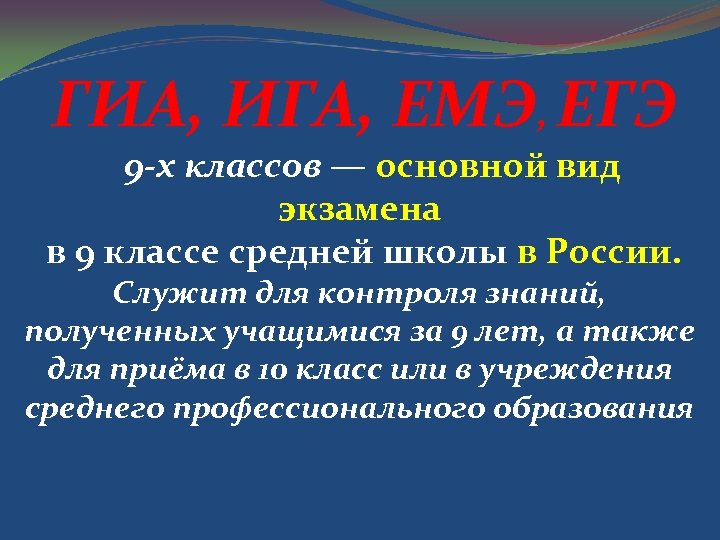 ГИА, ИГА, ЕМЭ, ЕГЭ 9 -х классов — основной вид экзамена в 9 классе средней школы в России. Служит для контроля знаний, полученных учащимися за 9 лет, а также для приёма в 10 класс или в учреждения среднего профессионального образования