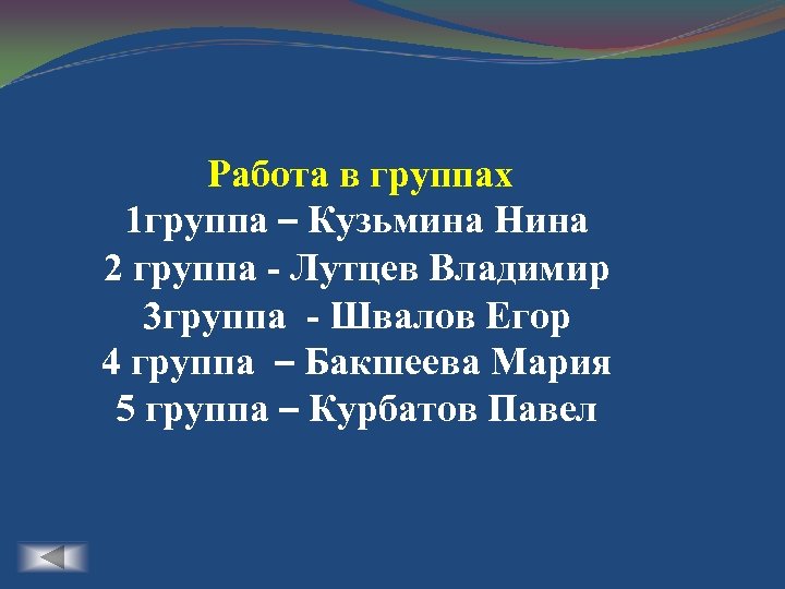 Работа в группах 1 группа – Кузьмина Нина 2 группа - Лутцев Владимир 3 группа - Швалов Егор 4 группа – Бакшеева Мария 5 группа – Курбатов Павел