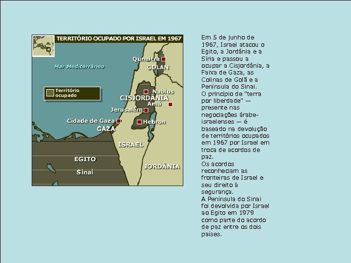 Em 5 de junho de 1967, Israel atacou o Egito, a Jordânia e a Síria e passou a ocupar a Cisjordânia, a Faixa de Gaza, as Colinas de Golã e a Península do Sinai. O princípio de "terra por liberdade" — presente nas negociações árabeisraelenses — é baseado na devolução de territórios ocupados em 1967 por Israel em troca de acordos de paz. Os acordos reconheciam as fronteiras de Israel e seu direito à segurança. A Península do Sinai foi devolvida por Israel ao Egito em 1979 como parte do acordo de paz entre os dois países.