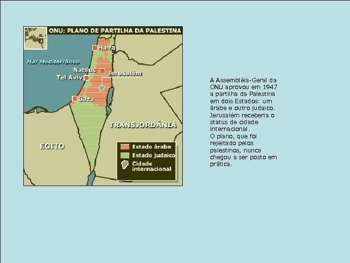 A Assembléia-Geral da ONU aprovou em 1947 a partilha da Palestina em dois Estados: um árabe e outro judaico. Jerusalém receberia o status de cidade internacional. O plano, que foi rejeitado pelos palestinos, nunca chegou a ser posto em prática.