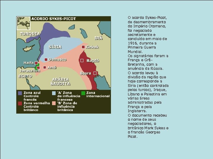 O acordo Sykes-Picot, de desmembramento do Império Otomano, foi negociado secretamente e concluído em maio de 1916, durante a Primeira Guerra Mundial. Os signatários foram a França e GrãBretanha, com a anuência da Rússia. O acordo levou à divisão da região que hoje corresponde a Síria (então controlada pelos turcos), Iraque, Líbano e Palestina em várias áreas administradas pela França e pela Inglaterra. O documento recebeu o nome de seus negociadores, o britânico Mark Sykes e o francês Georges Picot.