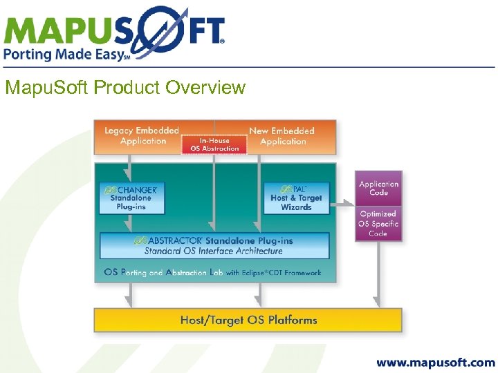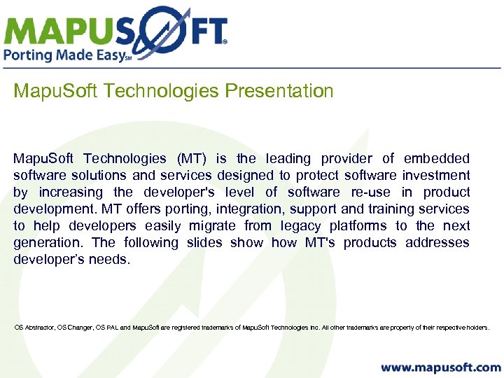 Mapu. Soft Technologies Presentation Mapu. Soft Technologies (MT) is the leading provider of embedded software solutions and services designed to protect software investment by increasing the developer's level of software re-use in product development. MT offers porting, integration, support and training services to help developers easily migrate from legacy platforms to the next generation. The following slides show MT's products addresses developer’s needs. OS Abstractor, OS Changer, OS PAL and Mapu. Soft are registered trademarks of Mapu. Soft Technologies Inc. All other trademarks are property of their respective holders.