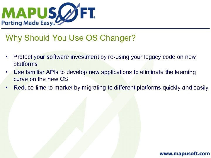 OS Changer Support Please visit http: //mapusoft. com/products/offerings/ to view a list of supported APIs and target operating systems