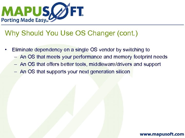 Why Should You Use OS Changer (cont. ) • Eliminate dependency on a single OS vendor by switching to – An OS that meets your performance and memory footprint needs – An OS that offers better tools, middleware/drivers and support – An OS that supports your next generation silicon