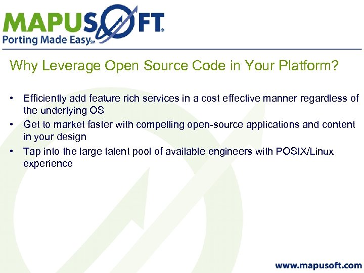 Why Extend Capacities of Your Proprietary OS? • Leverage re-usable open source POSIX/Linux code to efficiently add feature rich services in a cost effective to your proprietary OS • Make your application more compelling and valuable to your end users and customers • Make your proprietary OS more adaptable for your customers