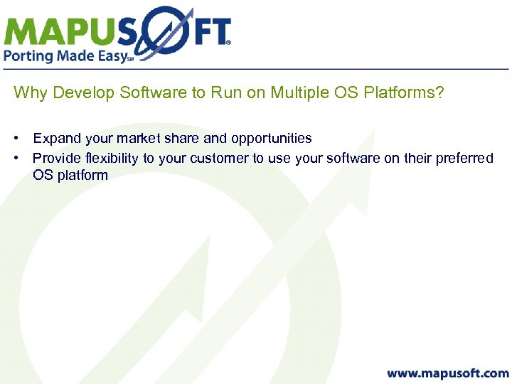 Why Develop Software to Run on Multiple OS Platforms? • Expand your market share and opportunities • Provide flexibility to your customer to use your software on their preferred OS platform