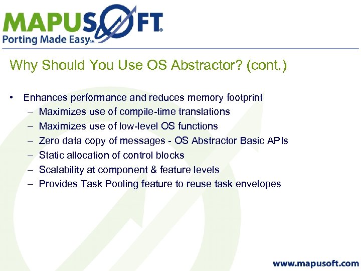 Why Should You Use OS Abstractor? (cont. ) • Enhances performance and reduces memory footprint – Maximizes use of compile-time translations – Maximizes use of low-level OS functions – Zero data copy of messages - OS Abstractor Basic APIs – Static allocation of control blocks – Scalability at component & feature levels – Provides Task Pooling feature to reuse task envelopes