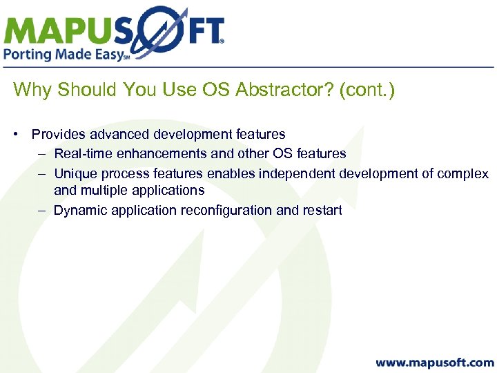 Why Should You Use OS Abstractor? (cont. ) • Provides advanced development features – Real-time enhancements and other OS features – Unique process features enables independent development of complex and multiple applications – Dynamic application reconfiguration and restart