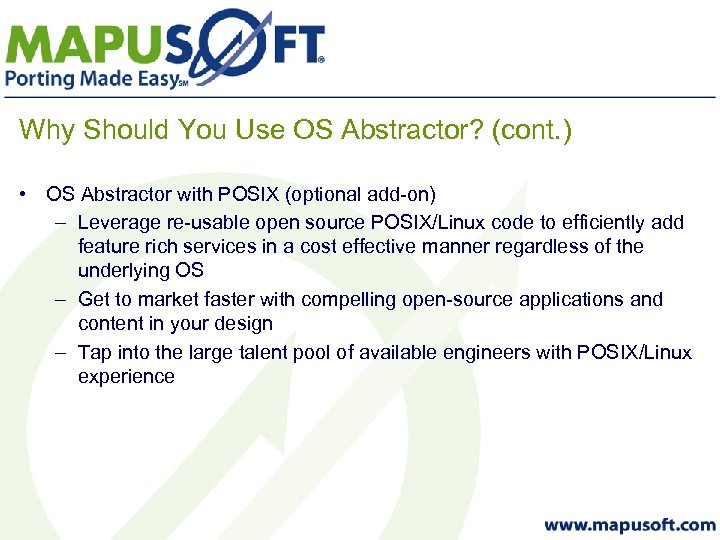 Why Should You Use OS Abstractor? (cont. ) • OS Abstractor with POSIX (optional add-on) – Leverage re-usable open source POSIX/Linux code to efficiently add feature rich services in a cost effective manner regardless of the underlying OS – Get to market faster with compelling open-source applications and content in your design – Tap into the large talent pool of available engineers with POSIX/Linux experience