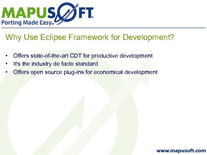 Why Use Eclipse Framework for Development? • Offers state-of-the-art CDT for productive development • It's the industry de facto standard • Offers open source plug-ins for economical development