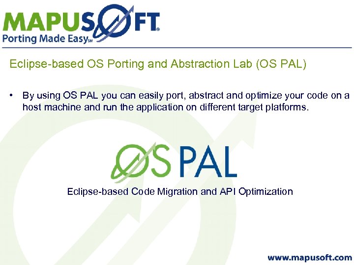 OS PAL Solution • Mapu. Soft’s OS Porting and Abstraction Lab (OS PAL) leverages the existing OS Changer and OS Abstractor technologies while adding advanced code optimization capacities on multiple OS environments. OS PAL provides users an easy-to-use graphical user interface that is integrated with the Eclipse® based CDT environment.