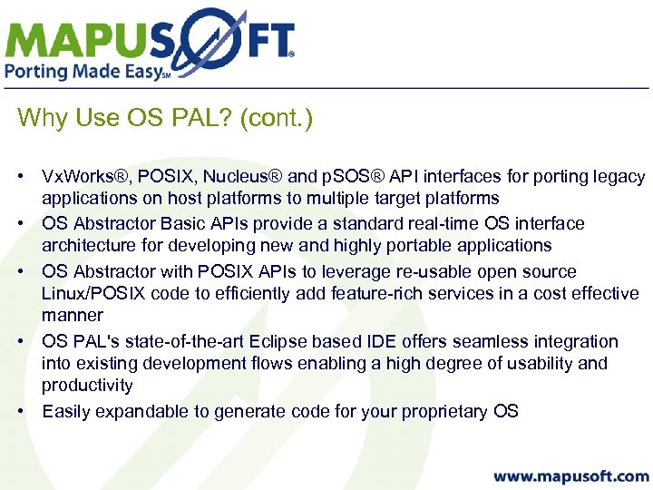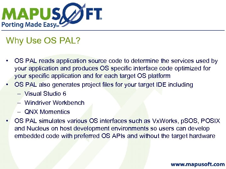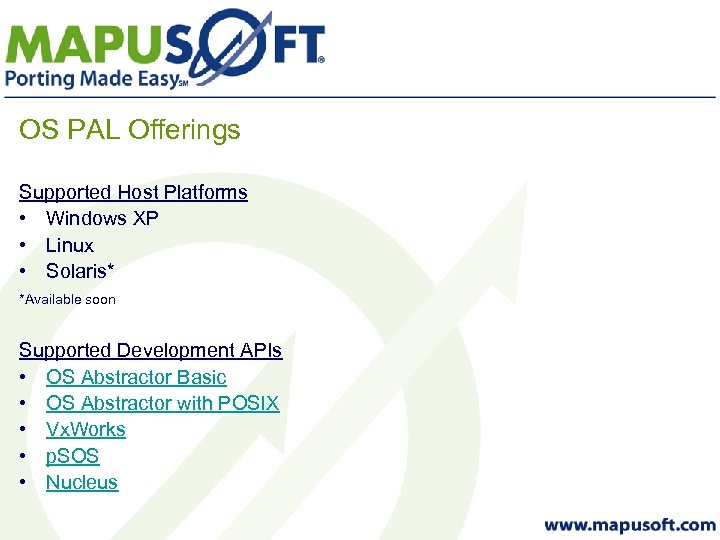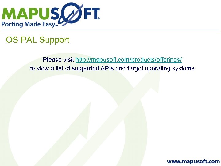 OS PAL Support Please visit http: //mapusoft. com/products/offerings/ to view a list of supported APIs and target operating systems