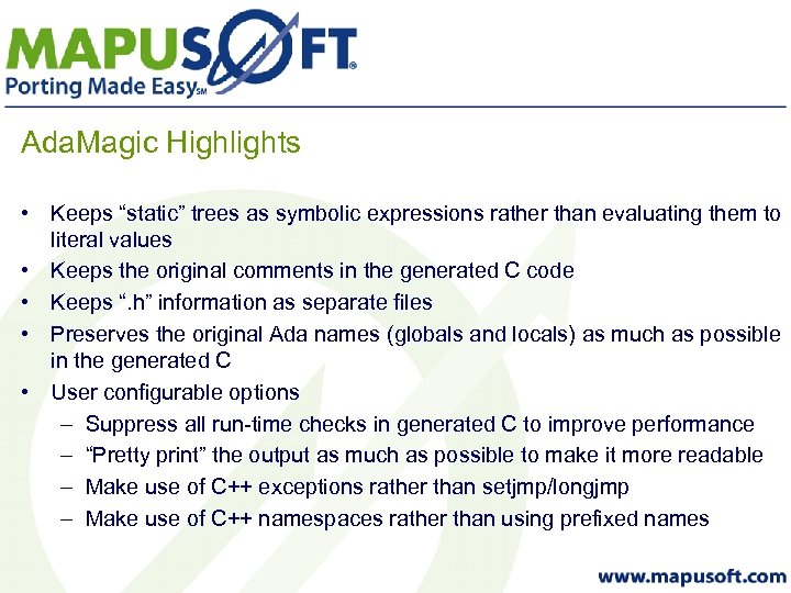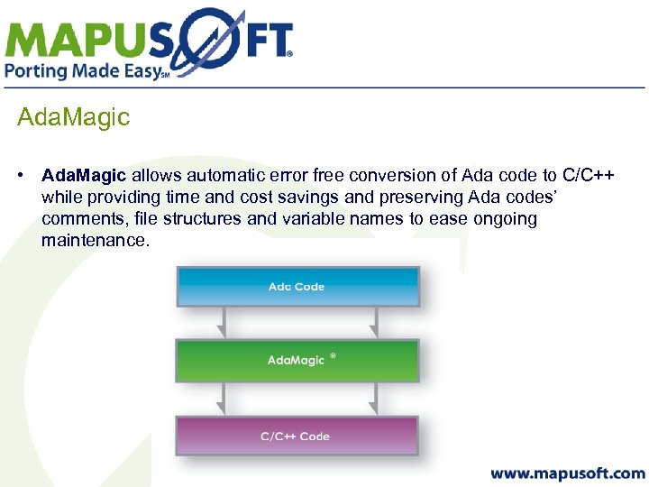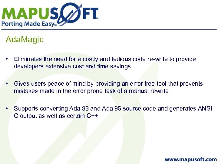 Ada. Magic • Eliminates the need for a costly and tedious code re-write to provide developers extensive cost and time savings • Gives users peace of mind by providing an error free tool that prevents mistakes made in the error prone task of a manual rewrite • Supports converting Ada 83 and Ada 95 source code and generates ANSI C output as well as certain C++