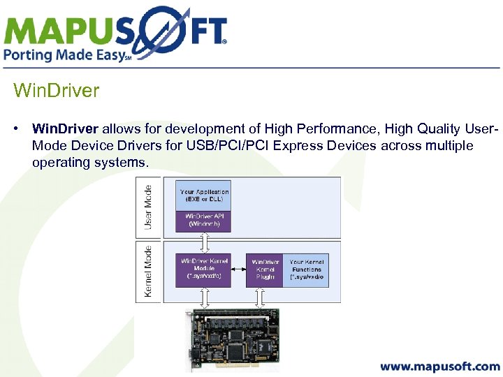 Win. Driver • Win. Driver allows for development of High Performance, High Quality User. Mode Device Drivers for USB/PCI Express Devices across multiple operating systems.