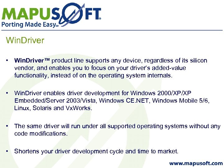 Win. Driver • Win. Driver™ product line supports any device, regardless of its silicon vendor, and enables you to focus on your driver’s added-value functionality, instead of on the operating system internals. • Win. Driver enables driver development for Windows 2000/XP/XP Embedded/Server 2003/Vista, Windows CE. NET, Windows Mobile 5/6, Linux, Solaris and Vx. Works. • The same driver will run under all supported operating systems without any code modifications. • Shortens your driver development cycle and time to market.